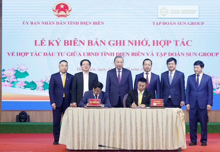 Tổng Bí thư Tô Lâm chứng kiến lễ ký biên bản hợp tác giữa Ủy ban nhân dân tỉnh Điện Biên và Tập đoàn Sun Group. (Ảnh: TTXVN)