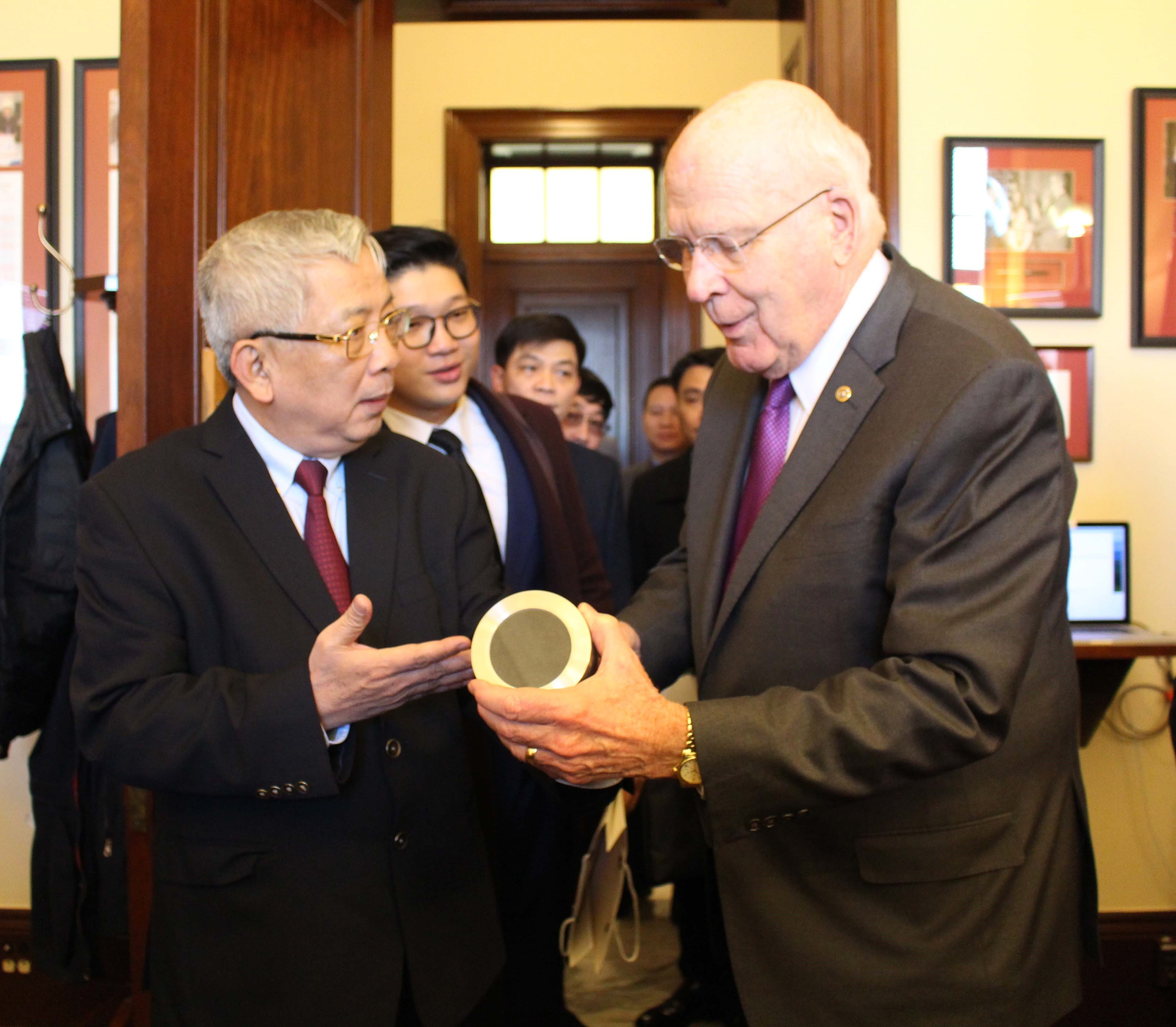 Senior Lieutenant General Nguyen Chi Vinh presented Senator Patrick Leahy with a box of dioxin detoxifying soil from Da Nang airport on the occasion of his trip to attend the 2019 Vietnam-US Defense Policy Dialogue.