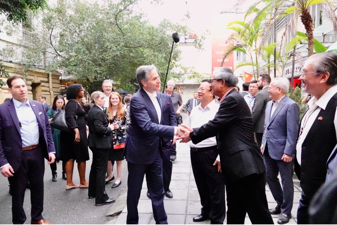The US Secretary of State, Antony Blinken, walked to a renowned jazz club on Trang Tien Street in Hanoi on the evening of April 15 after meetings with senior Vietnamese leaders. At the jazz club owned by musician Quyen Van Minh, Ambassador Pham Quang Vinh, representing the Vietnam-US society, congratulated Mr. Blinken on his early birthday. Attending the reception were Mr. Vu Xuan Hong, former president of VUFO; Mr. Nguyen Hai Giang, editor-in-chief of Vietnam-US Magazine and vice president of the Vietnam-US Society; and many other Vietnamese and American guests.